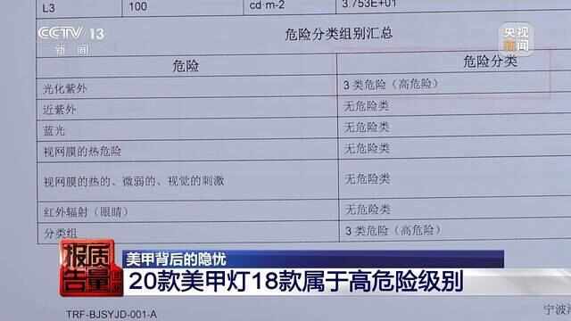 更为严重的是,20款美甲灯均存在紫外光源安全风险,其中18款样品工作时紫外光源对皮肤及眼睛的危险级别达到高危险级别,两款为中度危险级别。