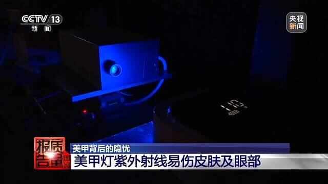 上海质检院国家电光源质量检验检测中心(上海)副主任杨樾:紫外光不能溢出到美甲灯这个设备以外,那也就是说这个制造商,必须保证所有的光都封闭在这个装置里面,这个美甲灯很多都是没有防护措施的,你会看到它里面的一些光溢出,这个溢出对眼睛的伤害是更大的。